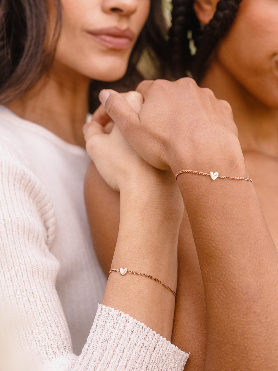 Durch Eure Herzen verbunden: Das Tiny Heart Armband-Set besteht aus zwei filigranen Armbändern mit einem kleinen Herz in der Mitte. Das minimalistische und doch bedeutungsvolle Design macht das Tiny Heart Armband-Set zu einem idealen Geschenk für Deine Liebsten und ist eine liebevolle Erinnerung an Eure Liebe oder Freundschaft. Du kannst die Farbe der Freundschaftsarmbänder mixen, heißt ein Armband zum Beispiel in Silber und eines in Gold wählen, damit es perfekt zu Euch und Eurer favorisierten Schmuckfarbe passt. Ein Symbol der Zuneigung, das Euren Alltag schmückt und jeden Moment ein bisschen besonderer macht.