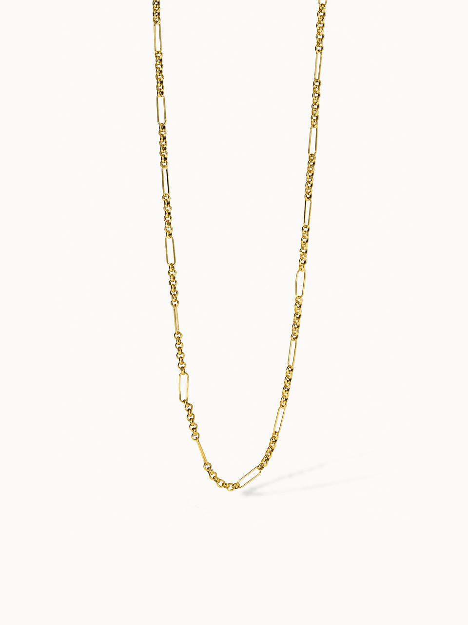 Goldene PURELEI Unison Kette mit unterschiedlichen Gliedern, elegant auf Sand gelegen, feminine Leichtigkeit.