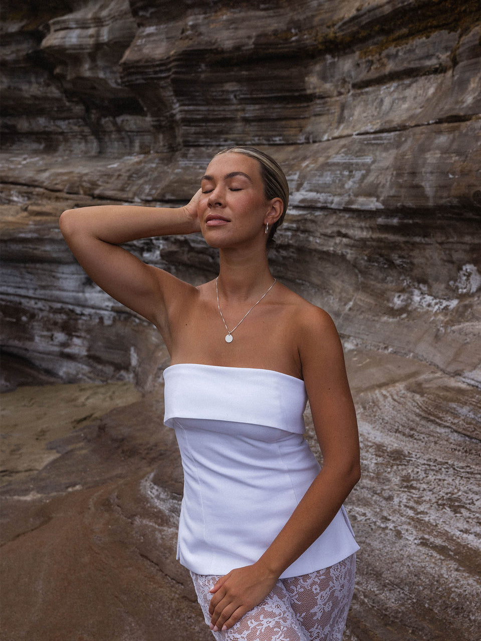 Perfection Charm silberner Charm an feiner Kette, natürlich und elegant, getragen in rauer Felskulisse mit PURELEI Flair