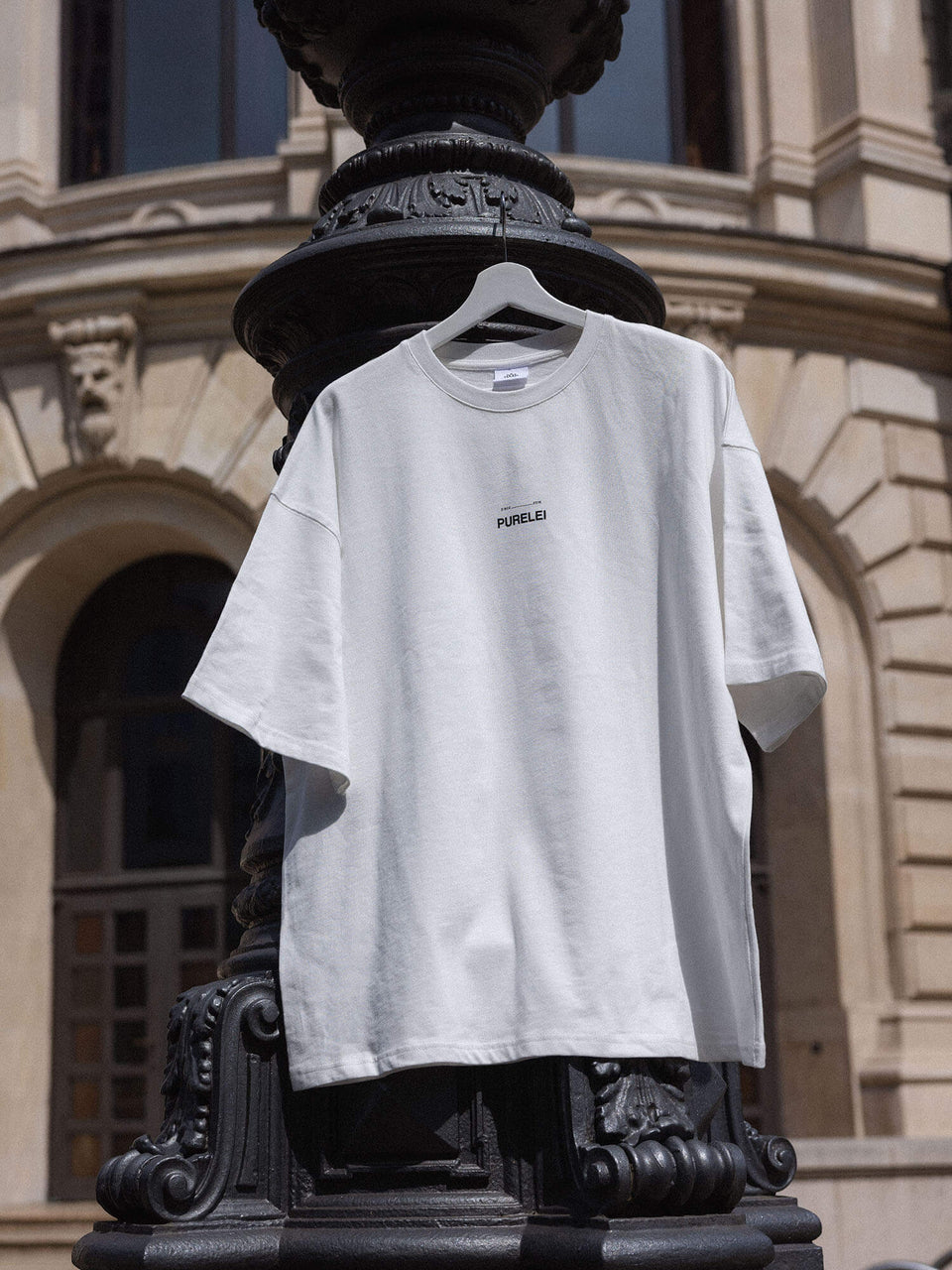 Weißes PURELEI T-shirt Feeling Pure White mit oversized Passform und markantem Frontprint in urbaner, klarer Ästhetik.
