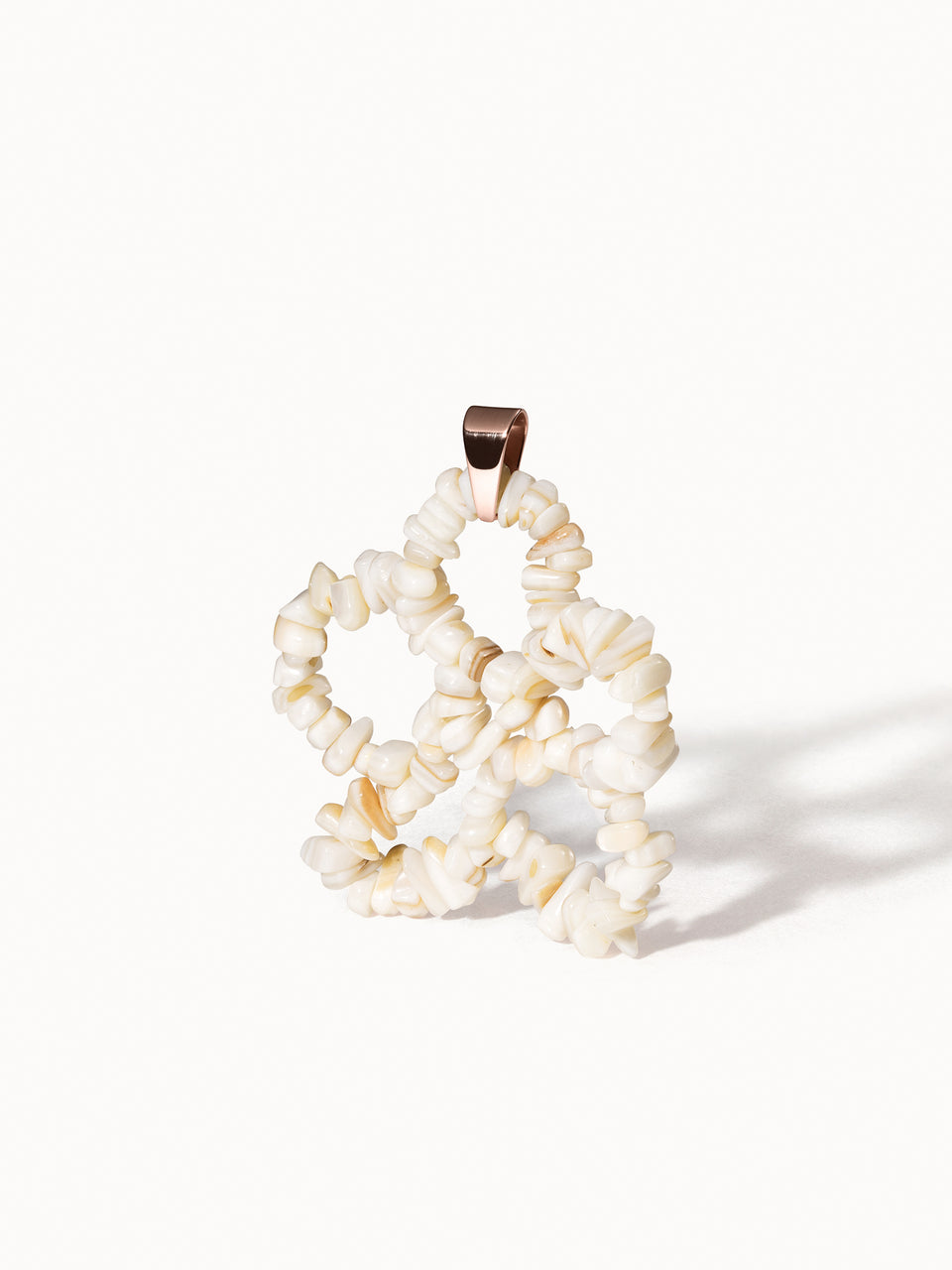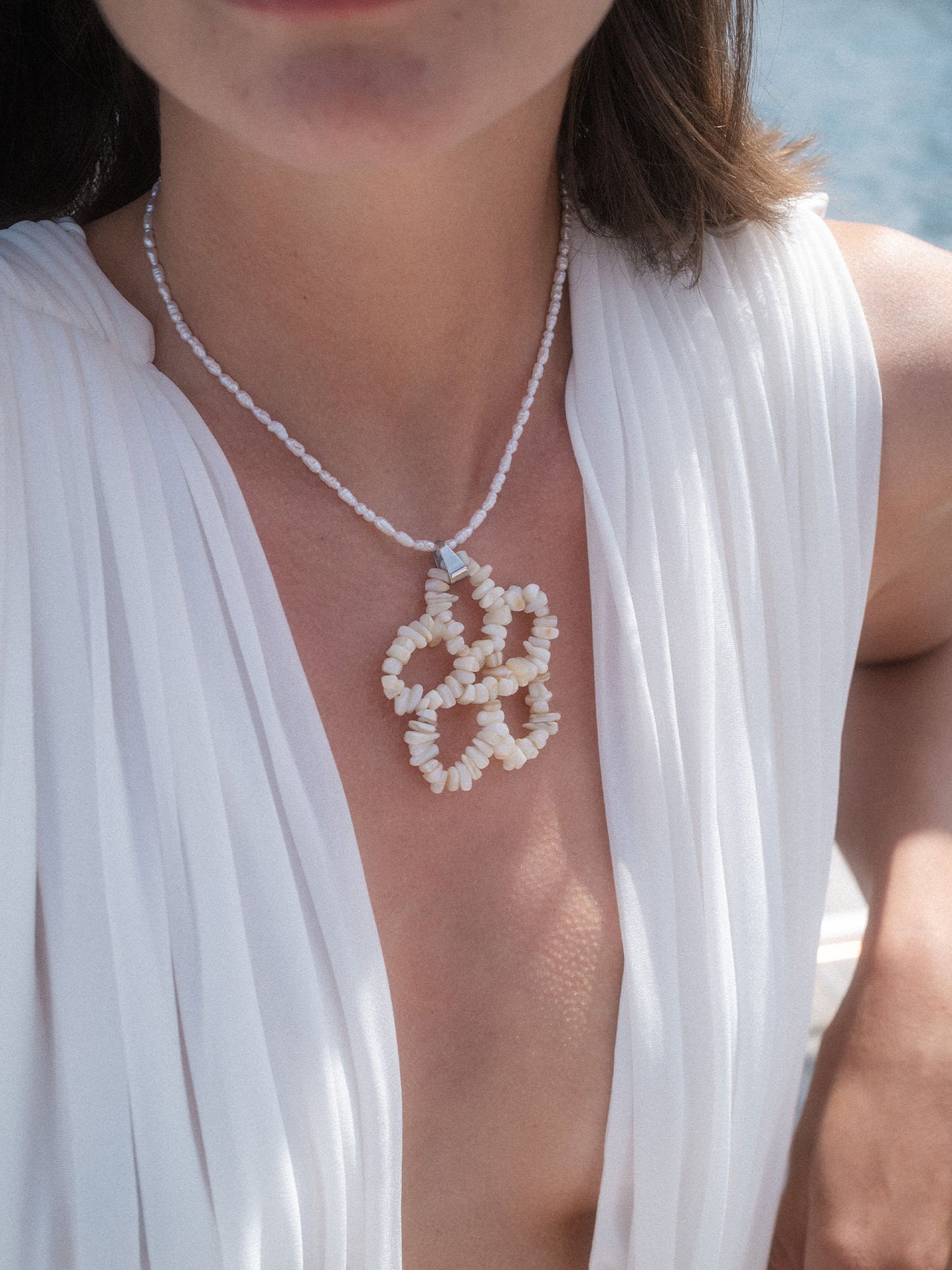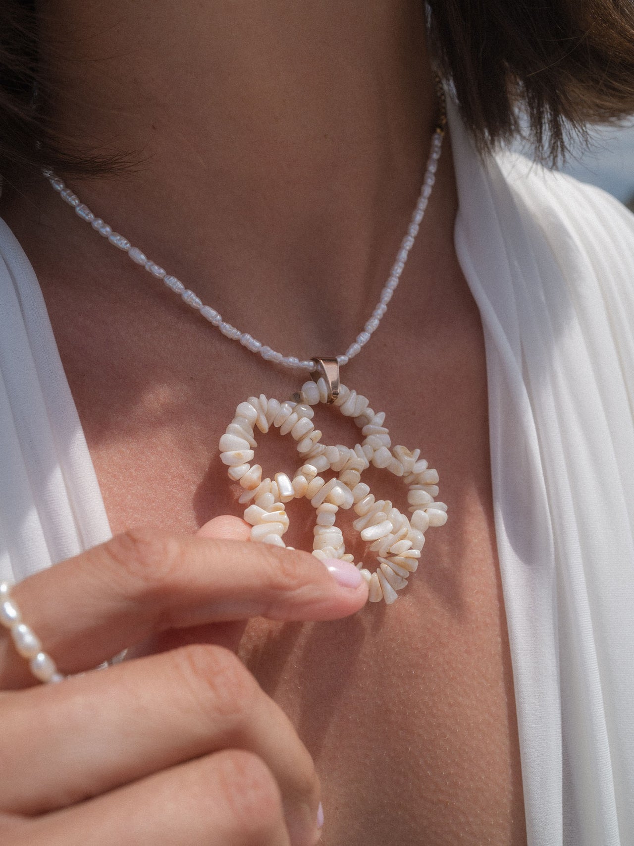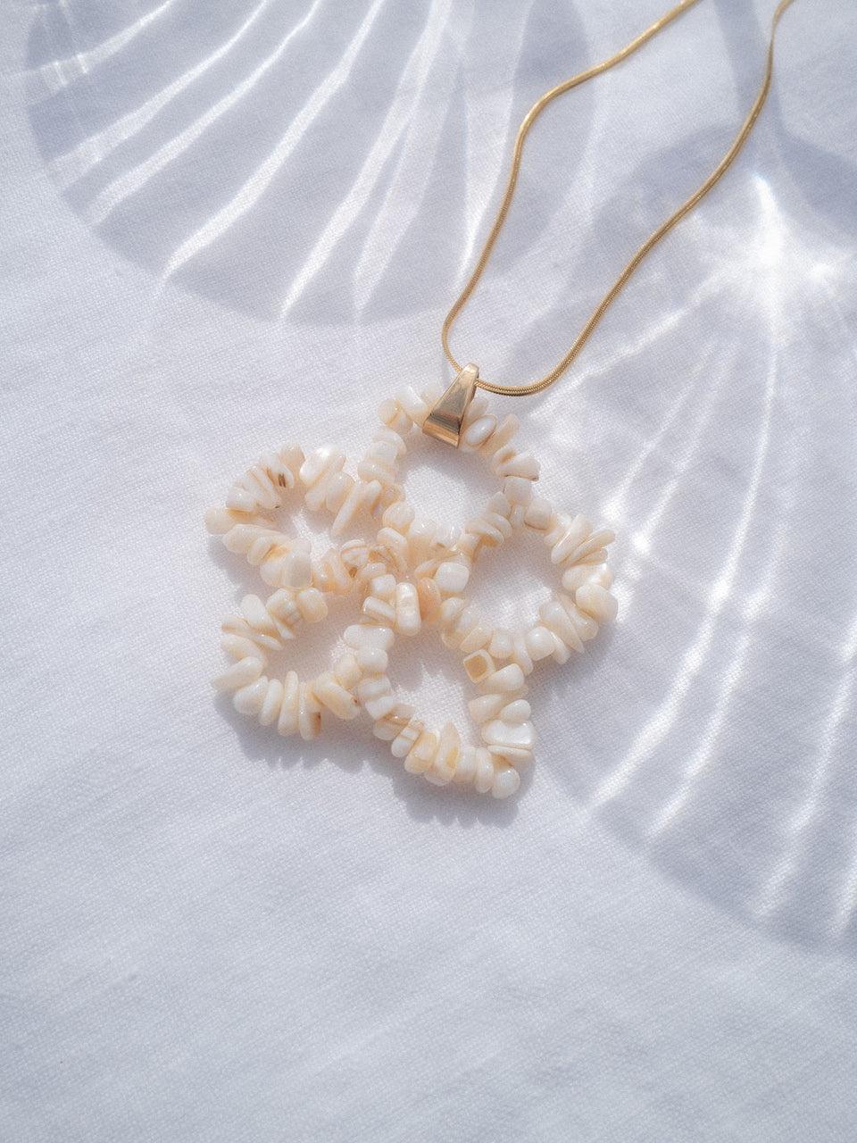 Der Blumencharm aus kleinen Muschelbruchstücken lässt sich vielfältig kombinieren und bringt pure Beach-Vibes in Deine Looks.