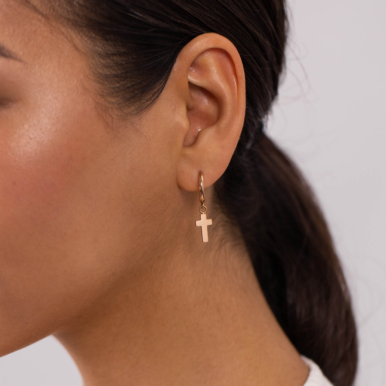 PURELEI Cross Creole Ohrringe aus 18K Roségold Edelstahl mit feinem Kreuzanhänger, elegant und feminin getragen.