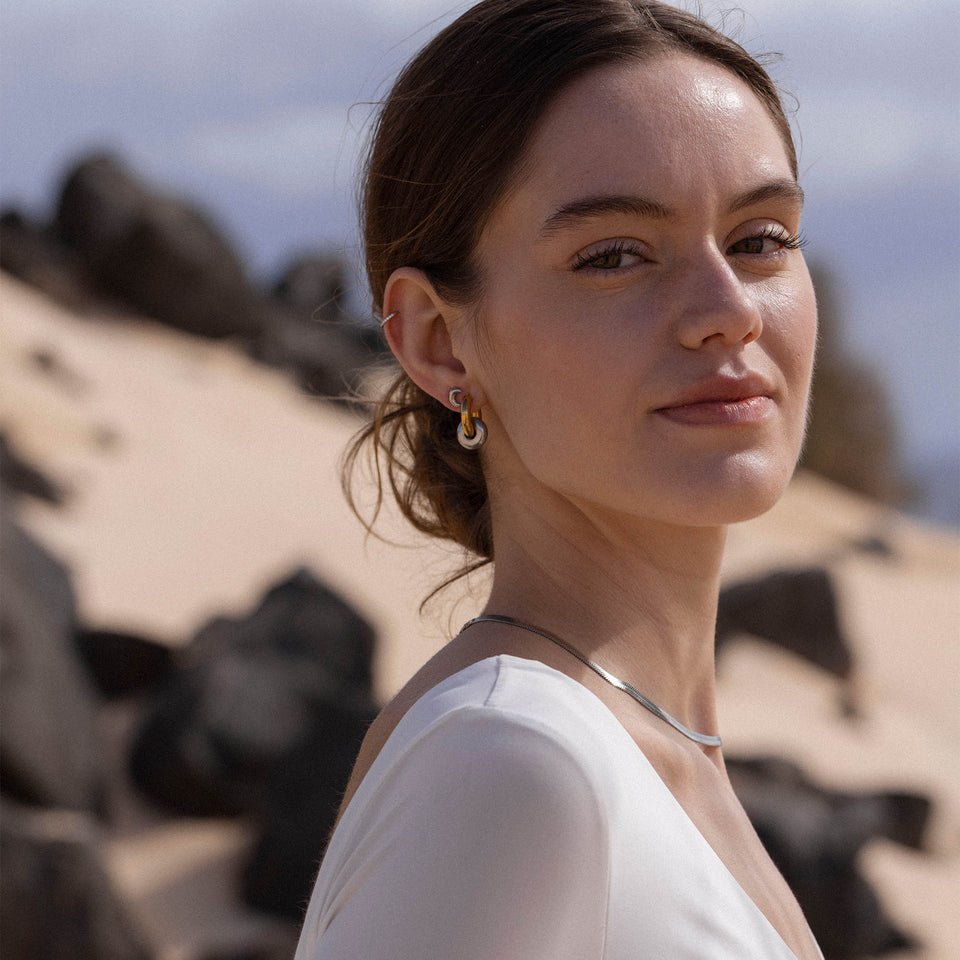 Silberne Creolen mit Roségold-Elementen, getragen in natürlicher Umgebung – PURELEI.