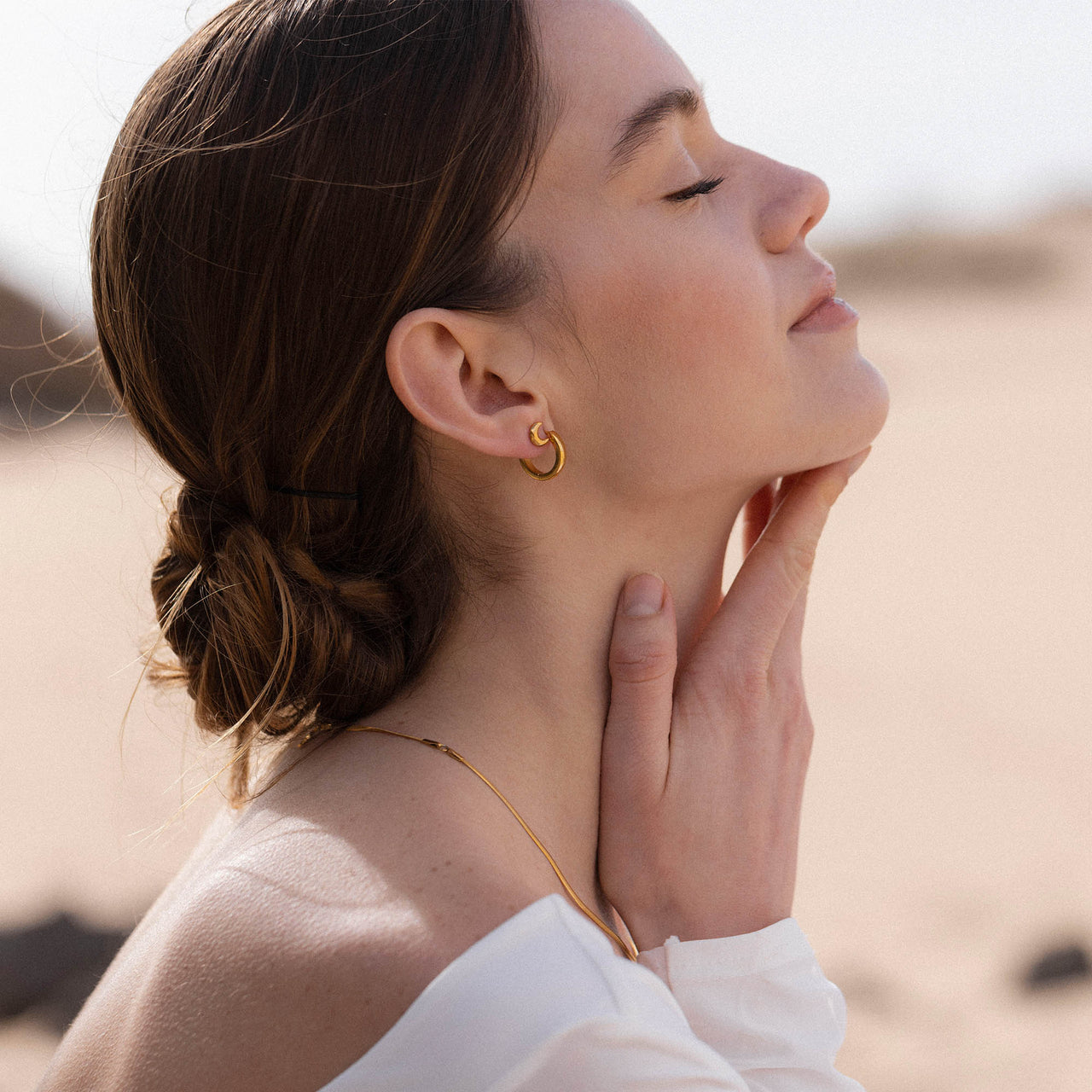 Goldene Creolen und zarte Kette von PURELEI, elegant und feminin, in warmem Licht.