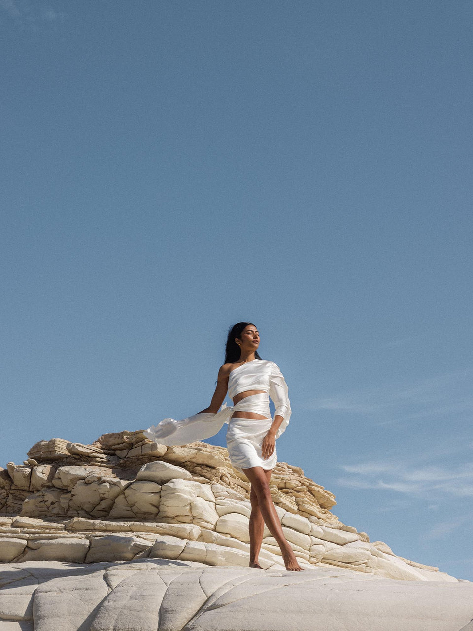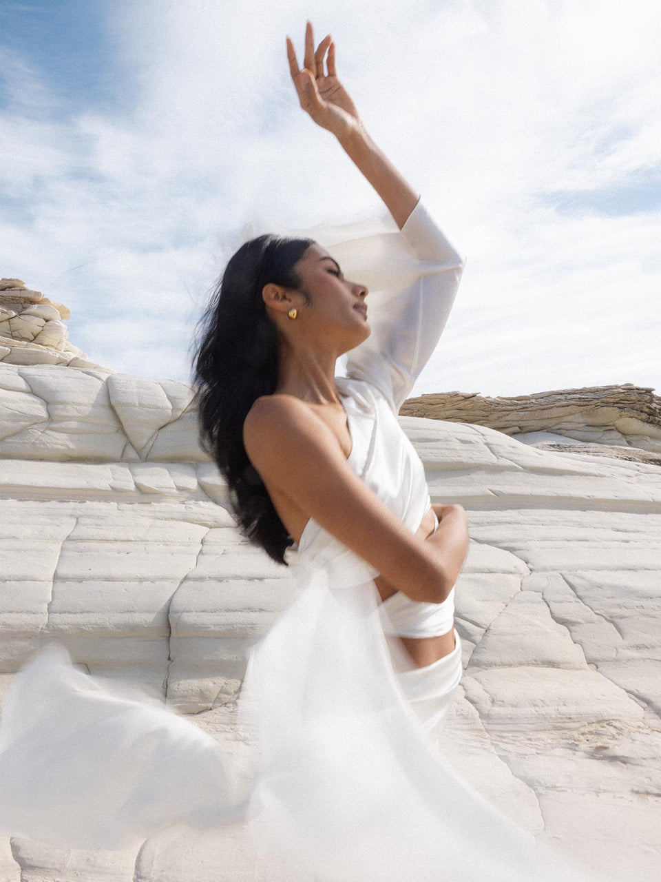 Eleganter Capricorn Letter Charm in 18K Gold, getragen vor hellem Felsen – pure femininer Island-Spirit von PURELEI.