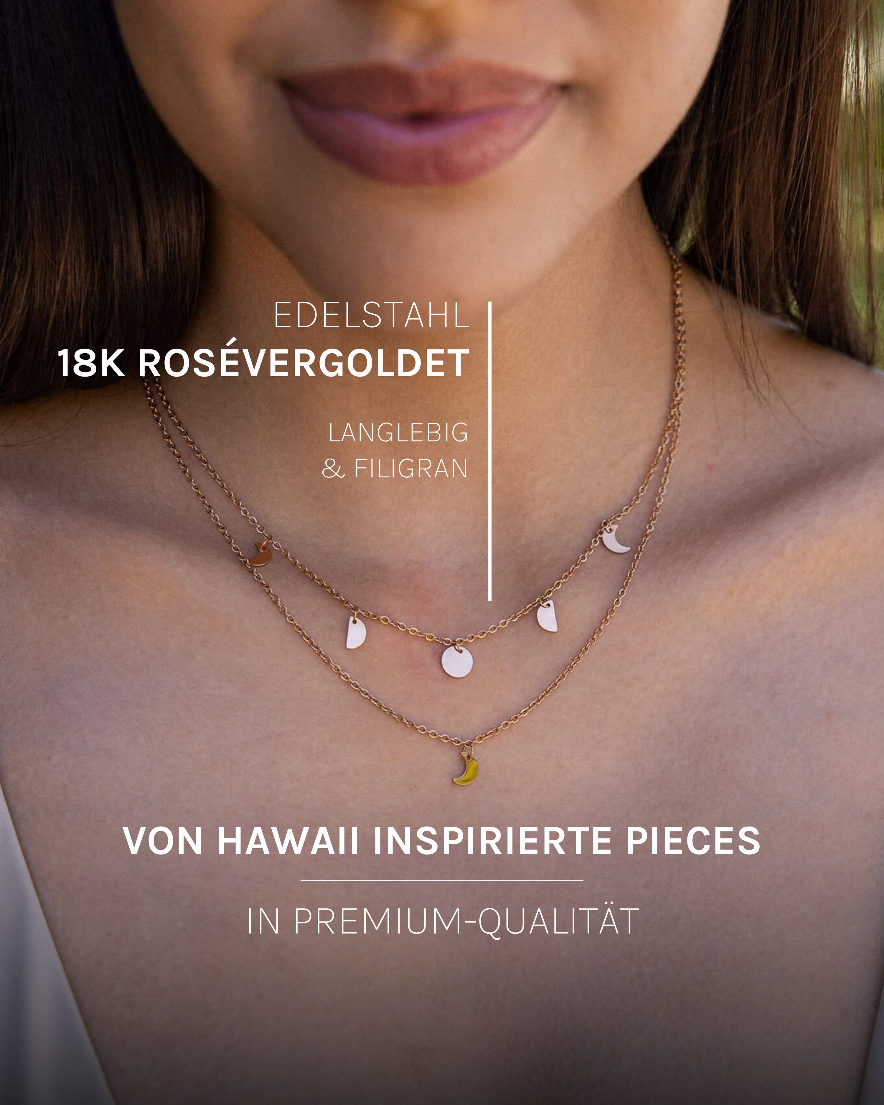 Luna Kette von PURELEI, filigrane, 18K rosévergoldete Edelstahlkette mit Mond-Anhängern, elegant und leicht am Dekolleté.
